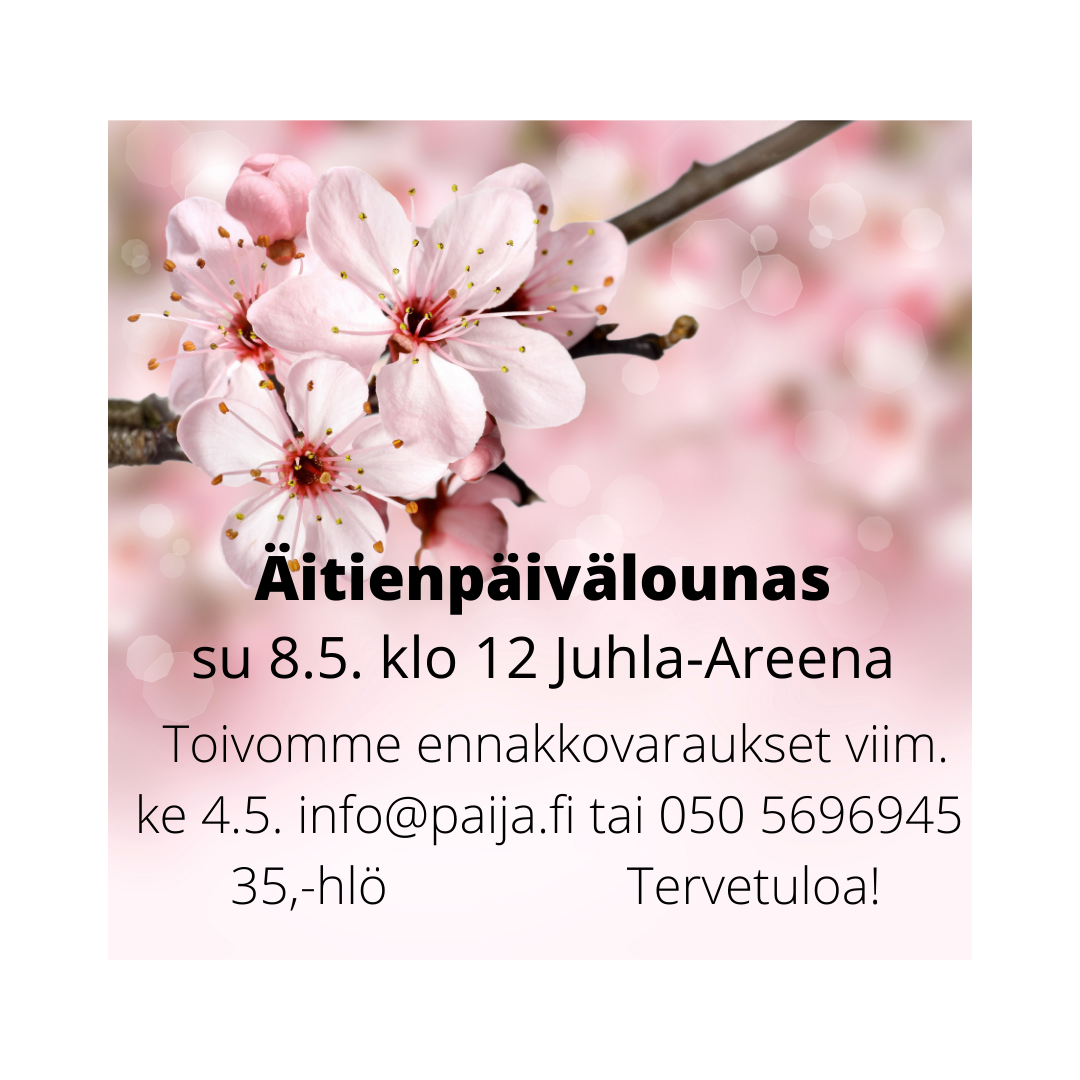 On ehtinyt kulua kaksi vuotta siitä, kun edellisen kerran saimme kutsua äitejä läheisineen pöytäämme. Nyt viimeinkin, tervetuloa klo 12 alkaen Juhla-Areenalle lounastamaan! Haluamme tietenkin olla vastuullisia niin monella saralla kuin mahdollista, siksi ennakkoilmottautumiset ke 4.5. mennessä ovat tärkeitä. Saamme tehtyä juuri oikean määrän vastuullista, herkullista, paijalaista ruokaa.